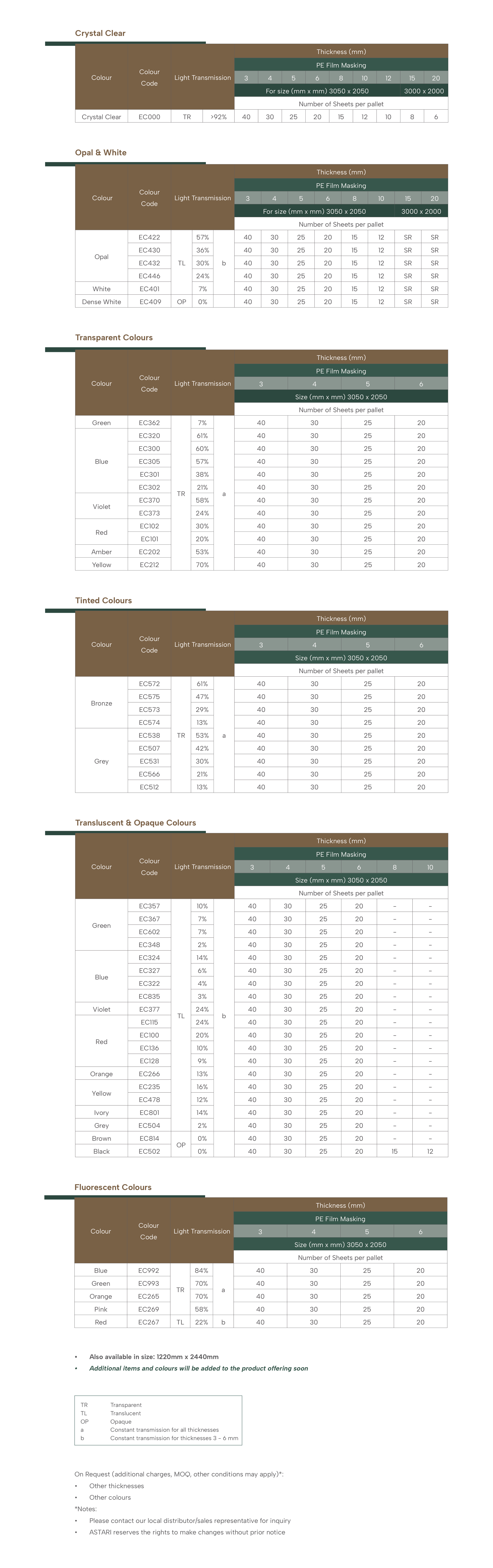All ASTARIGLAS® Cast Acrylic Sheets are manufactured to meet the standard specification of ASTM D 4802-10.
